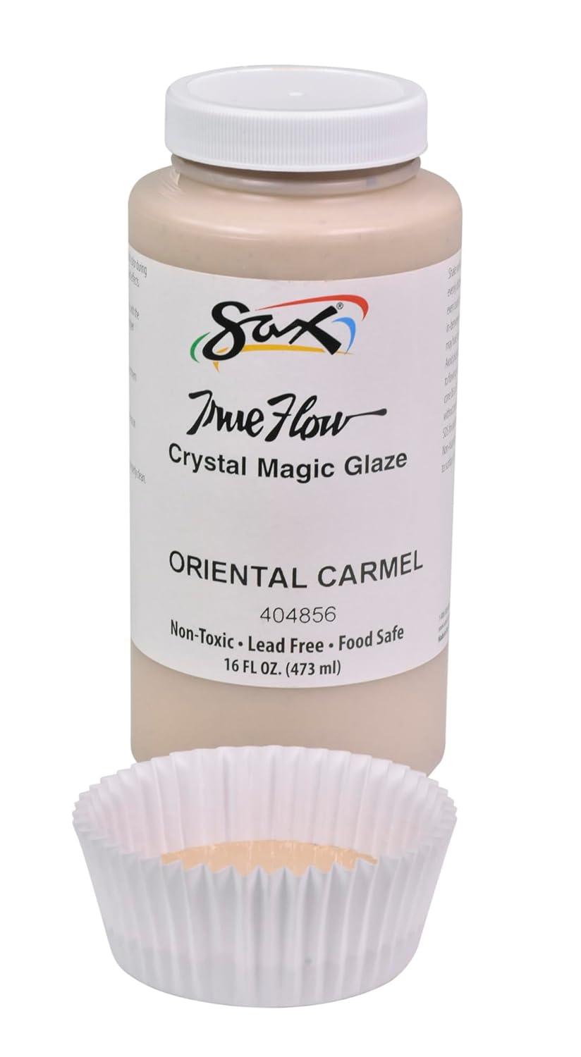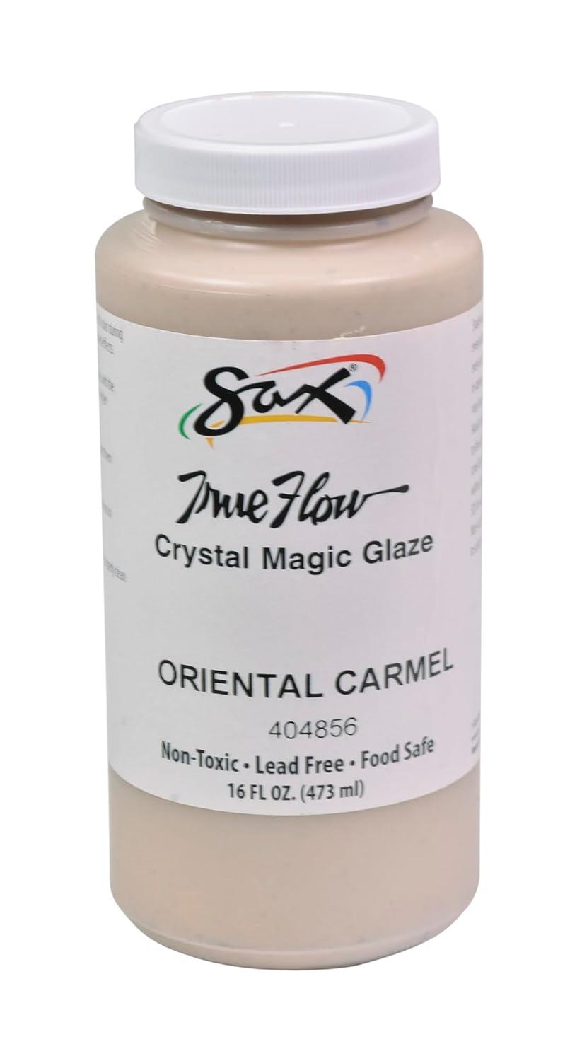 Sax Crystal Magic Glaze in semi-opaque Oriental Carmel features tiny crystals mixed with a speckled base which melt and move during firing, allowing colors to bloom for beautiful, one-of-a-kind designs. Every application and firing will produce different results for unique pottery and ceramic projects. The painting glaze may appear a different color during application and change to the desired look after the required firing in a kiln. Our ceramic glaze paint creates multi-colored patterns when fired. The base glaze lightens and crystals will fade and cascade when fired at cone 6.Download Sax True Flow Glaze Care Tips