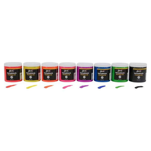 Print with pizazz! Intense neon pigments in water based ink lend one-and-done vibrant excitement to relief printing (the art of inking a rubber stamp in ink pad and pressing onto another material to leave an impression). Fluorescent hues are especially effective on black or dark-colored papers; water-resistant once dried. Water-based formulate provides comparable performance qualities to oil-based inks, without the mess! Comes in convenient wide-mouthed 8 ounce plastic jars. Non-toxic; conforms to ASTM-4236 standards with ACMI AP (Approved Product) certified seal. Proudly made in the USA.