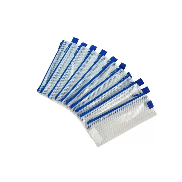 imageSax Mesh Tool Case Pouch for Pencils Pens Markers and School Supplies 3 x 8 inches Clear with Blue Trim Pack of 10