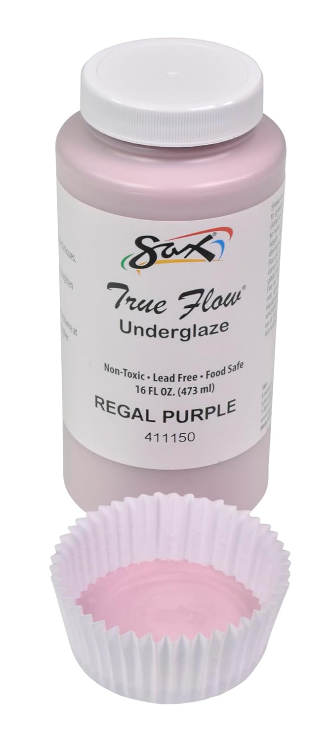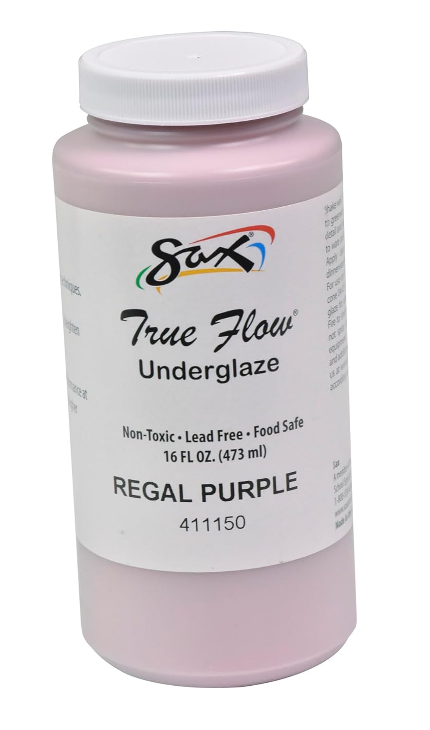 Sax Regal Purple underglaze paint comes in a concentrated opaque liquid color. Decorate pottery with this glazing paint that's ready for use on clay, greenware, and bisque. The color may be a different shade during application and will change to the desired look after the required kiln firing. This painting medium's color slightly darkens when fired at cone 6. Our high-quality underglaze has a matte look after firing and can be transformed to a shiny, rich glaze appearance with a transparent glaze coating on top.Download Sax True Flow Glaze Care Tips