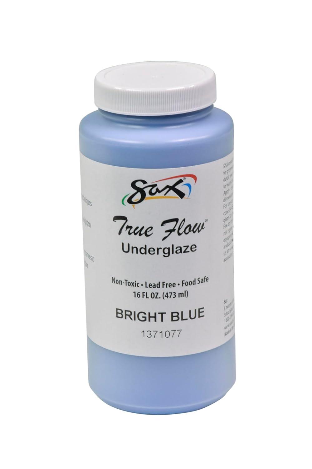 Sax Bright Blue underglaze paint comes in a concentrated opaque liquid color. Decorate pottery with this glazing paint that's ready for use on clay, greenware, and bisque. The color may be a different shade during application and will change to the desired look after the required kiln firing. This painting medium's color darkens when fired at cone 6. Our high-quality underglaze has a matte look after firing and can be transformed to a shiny, rich glaze appearance with a transparent glaze coating on top.Download Sax True Flow Glaze Care Tips
